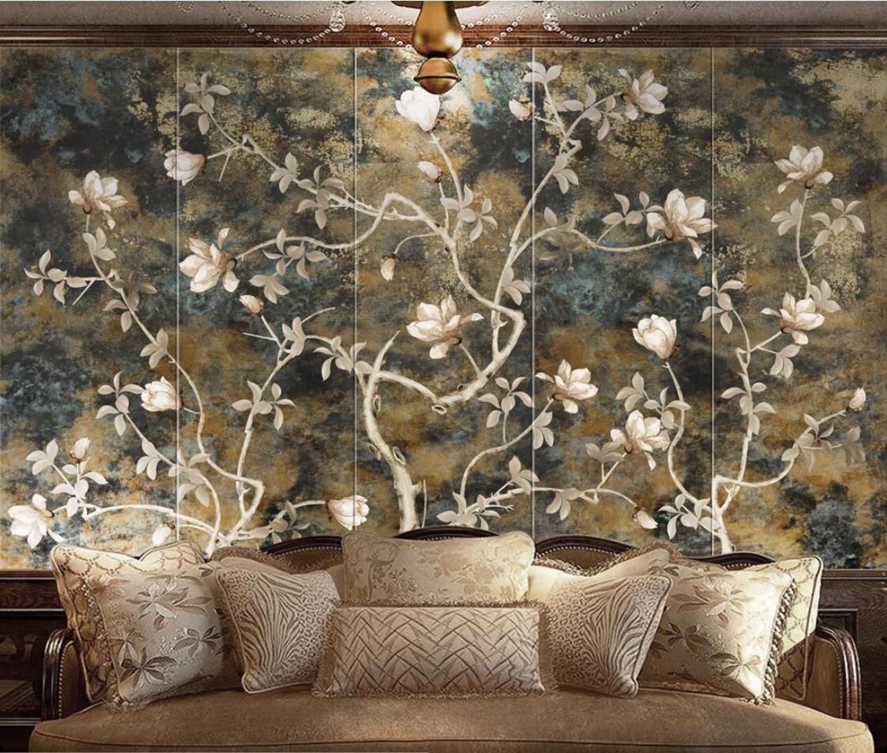 Hand Painted Dark Flower Bird Wallpaper Mural For Living Room