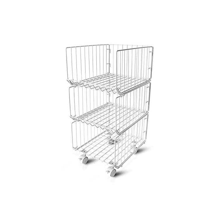 Metal Wire Baskets 3 Tiers Foldable Stackable Rolling Baskets Utility Shelf Unit Storage Organizer Bin With Wheels For Kitchen Pantry Closets Bedrooms Bathrooms
