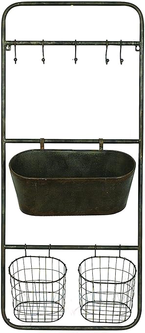 Amazon Com Creative Co Op Metal Wall Rack With 5 Hooks 3 Baskets Hanging Organizer Grey Kitchen Dining