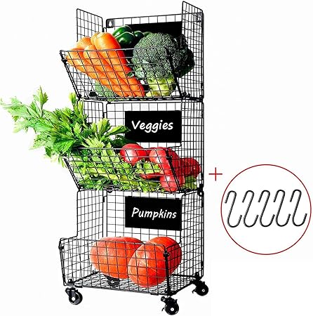 X Cosrack 3 Tier Metal Wire Baskets Wall Storage Basket Organizer With Wheel S Hooks Adjustable Chalkboards Hanging Baskets For Kitchen Fruit Vegetables