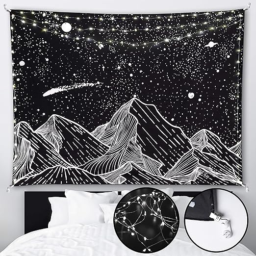 Amazon Com Happystries Mountain And Star Tapestry Comes With 10 Meters Led String Lights And Hanging Clips Wall Tapestry Black And White Moon Tapestry Wall Hanging
