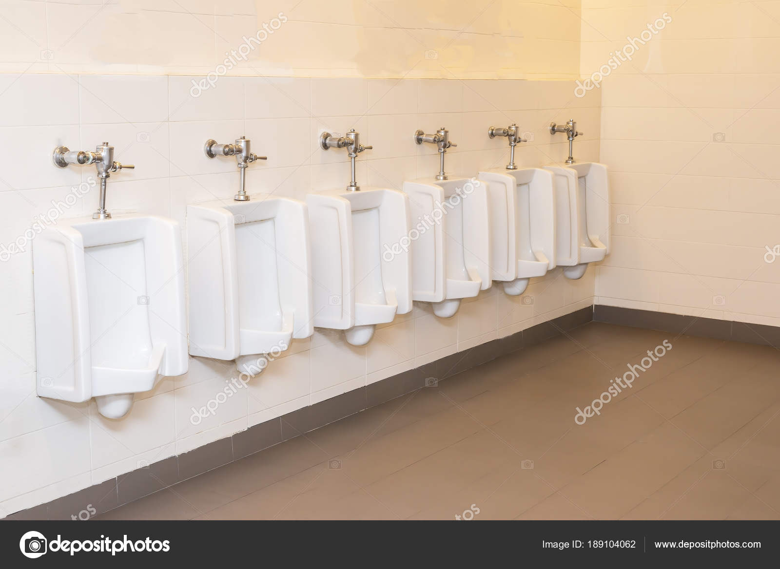 Row Of White Urinal For Men On Tile Wall In Toilet Stock Photo