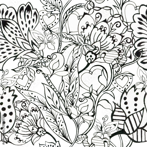 Black And White Outline Seamless Pattern Floral Background Flowers