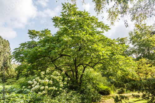 Walnut Tree In Garden With White Flowers Stock Photo Picture And