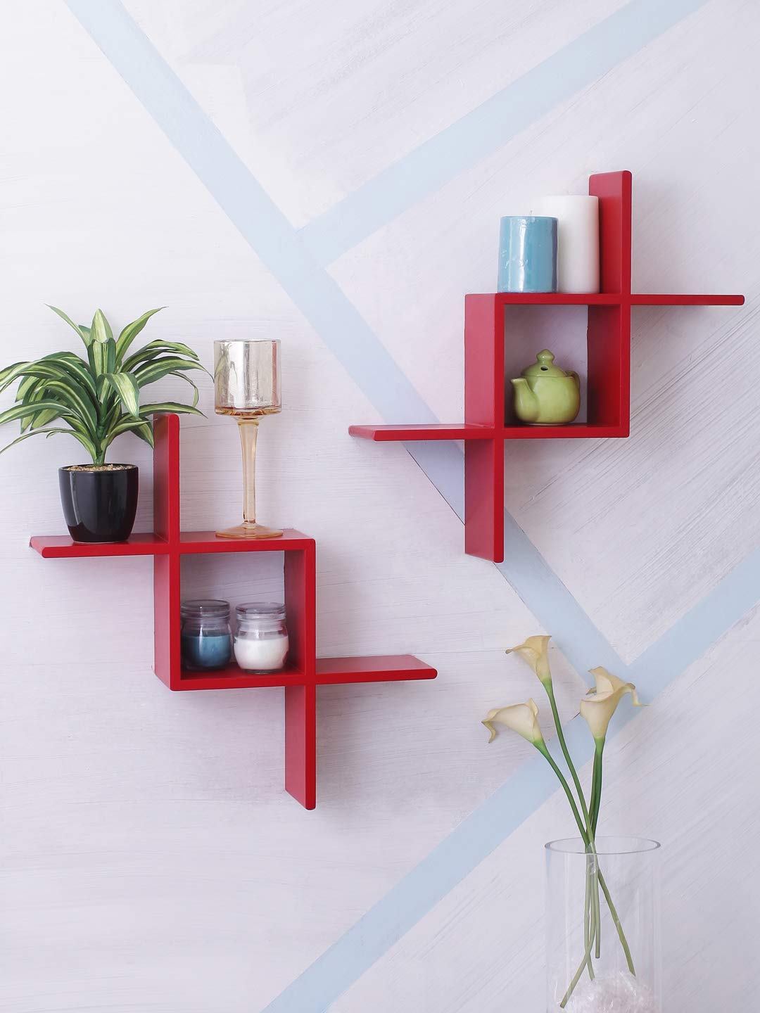 Cube Shape Wooden Wall Shelves For Living Room Red White